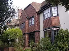 - Windows are typically double hung sash frames with diamond pattern leadlight glazing characteristic of the English Domestic Revival mode.